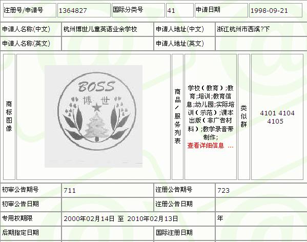 杭州某培训学校的第1364827号“博世BOSS及图”商标的申请日为1998年9月21日,注册商标专用权截止期限为2010年2月13日。注册服务类别为第41类:学校(教育)、教育、培训、教育信息、幼儿园、实际培训(示范)、课本出版(非广告材料)、教学录音带制作”。