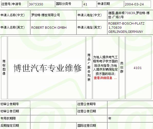 据了解,德国博世公司于2004年3月向中国商标局申请注册“博世汽车专业维修”商标申请注册的服务类别为第41类:为他人提供电气工程和电子学方面的培训与指导、为他人提供车辆保险定损方面的培训。其中,“汽车专业维修”放弃专用权。