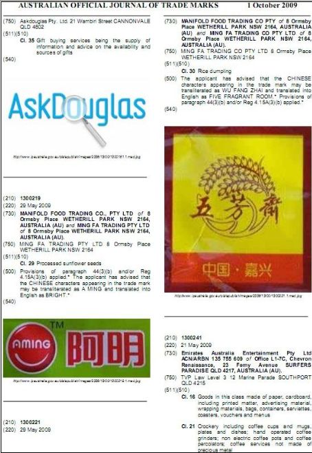 佳茂公司国际部监测到中华老字号“五芳斋”以及著名商标“阿明”在澳大利亚被抢注2009-10-16 14:15:42 |