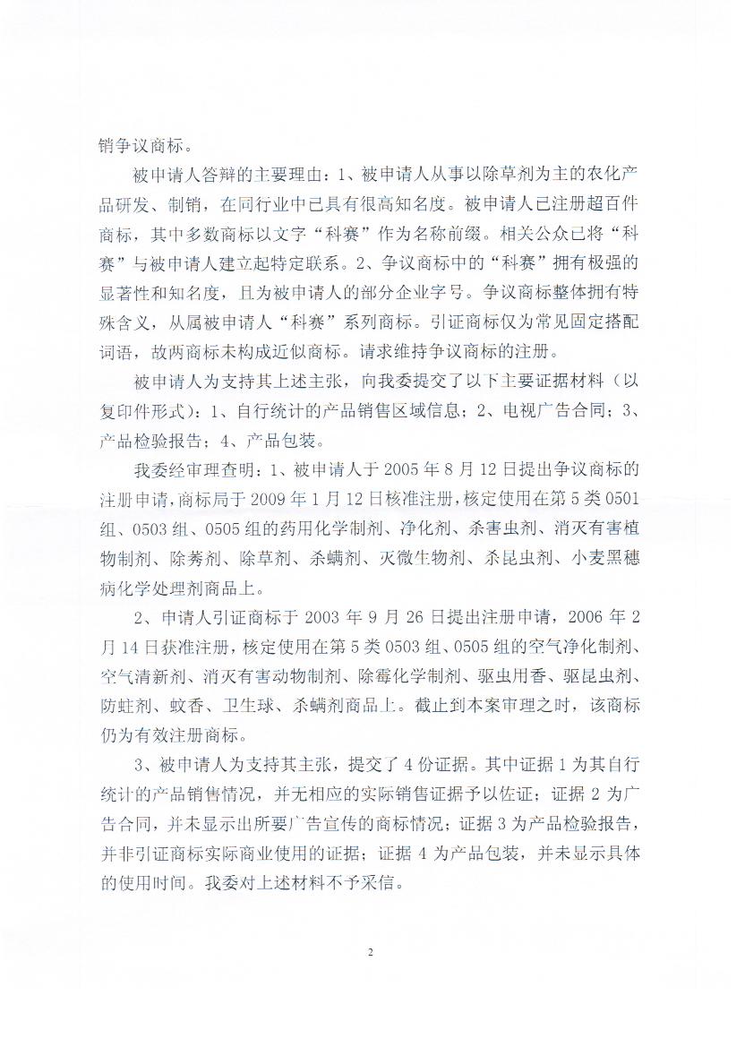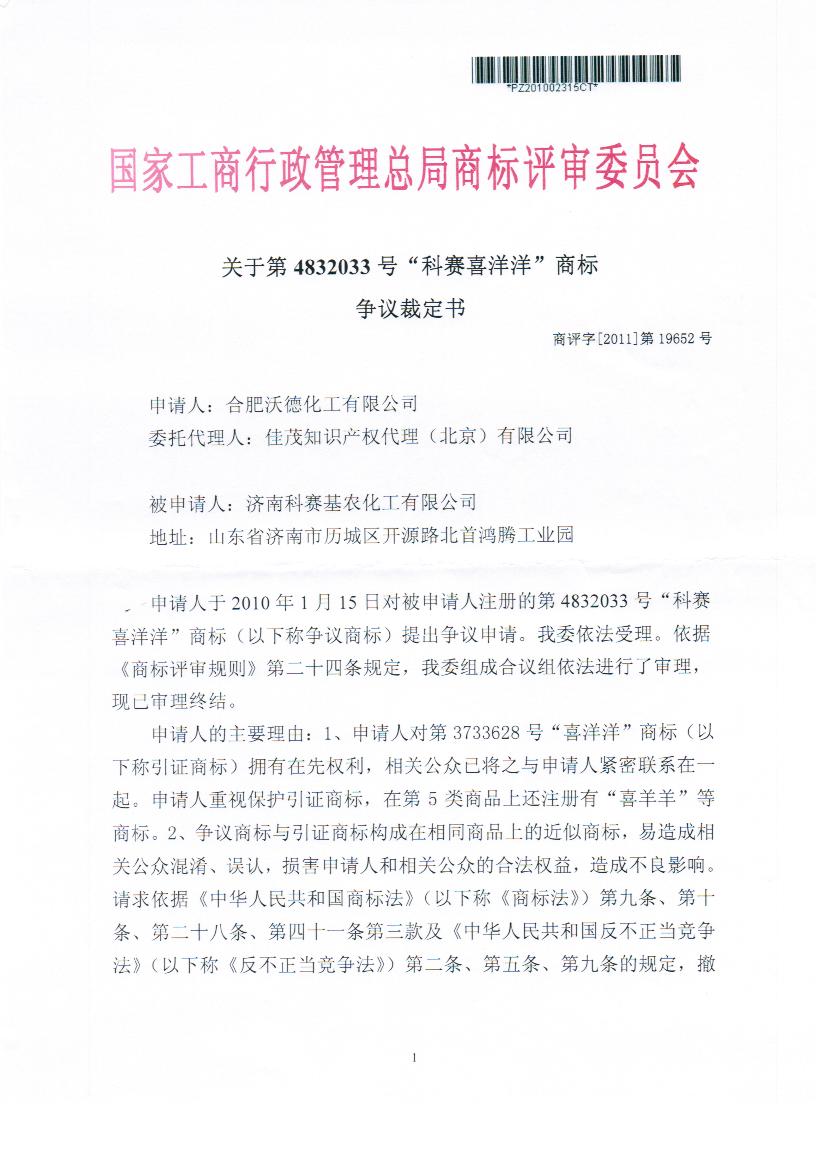 背景 经过我司监测,发现济南科赛基农化工有限公司在2005-08-12向商标局申请注册"科赛喜洋洋"商标,并于2009-01-21被商标局核准注册,注册号为4832033。 合肥沃德化工有限公司收到我司的监测报告后,立即委托我司对该商标申请撤销。