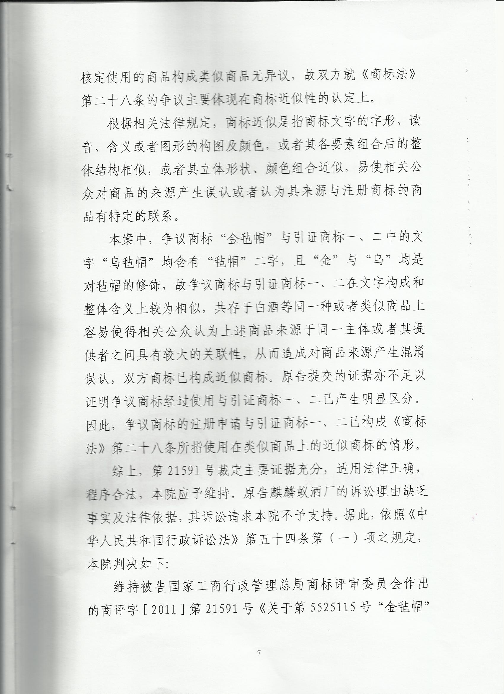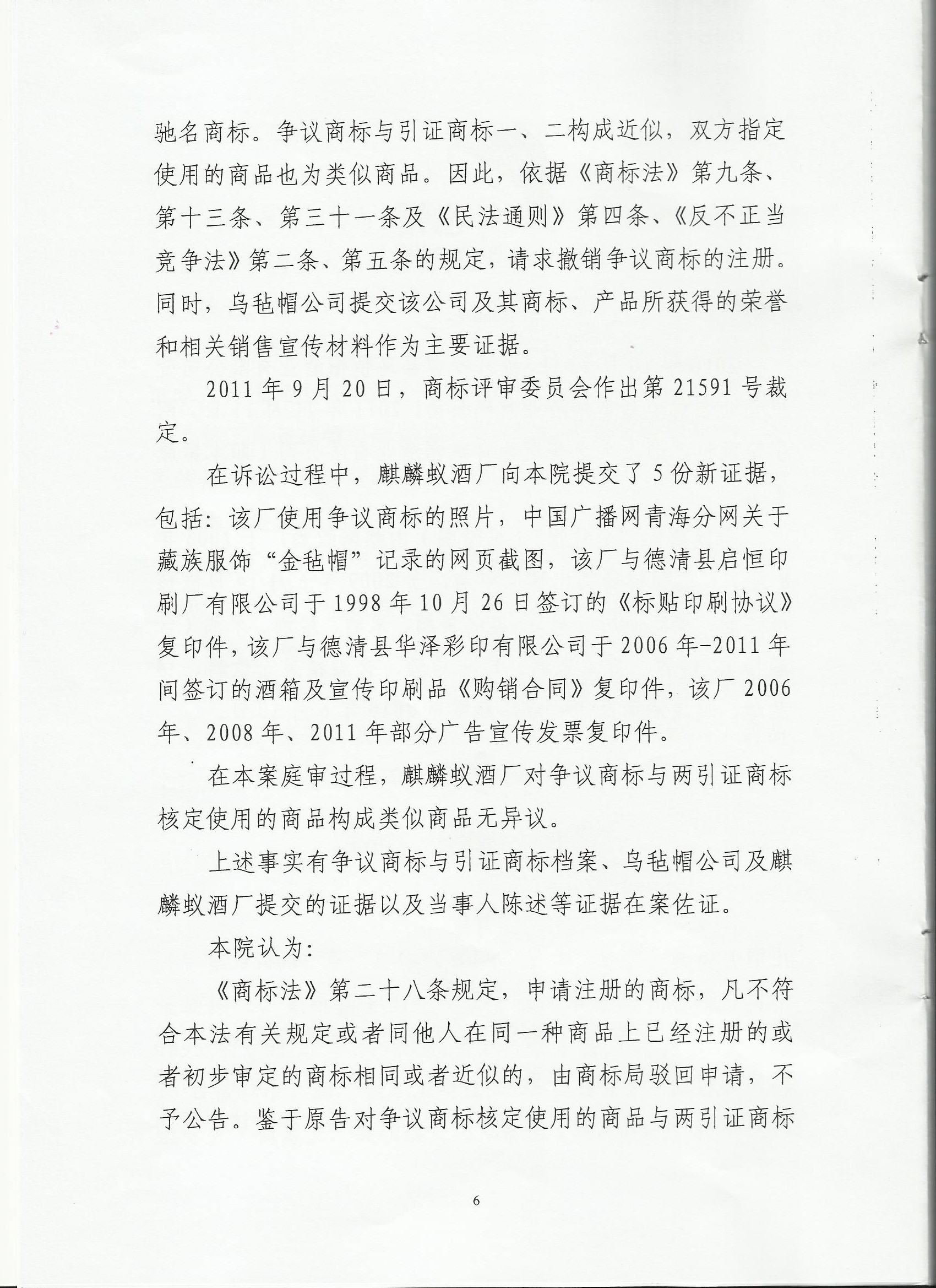 案件回顾: 佳茂公司成功代理乌毡帽酒业有限公司对德清县浙北麒麟蚁酒厂商标争议案件 原告德清县浙北麒麟蚁酒厂不服商标评审委员会于2011年9月20日作出的商评字[2011]第21591号《关于第5525115号“金毡帽”商标争议裁定书》(简称第21591号裁定),向北京第一中级人民法院提起行政诉讼,佳茂知识产权代理(北京)有限公司作为第三人乌毡帽酒业有限公司代理人参加诉讼,本案于2012年2月15日开庭审查。 北京第一中级人民法院认为系争议商标“金毡帽”商标与乌毡帽酒业有限公司的“乌毡帽”是近似商标,裁定商标评审委证据充分,适用法律正确,程序合法,判决维持第21591号裁定。 |