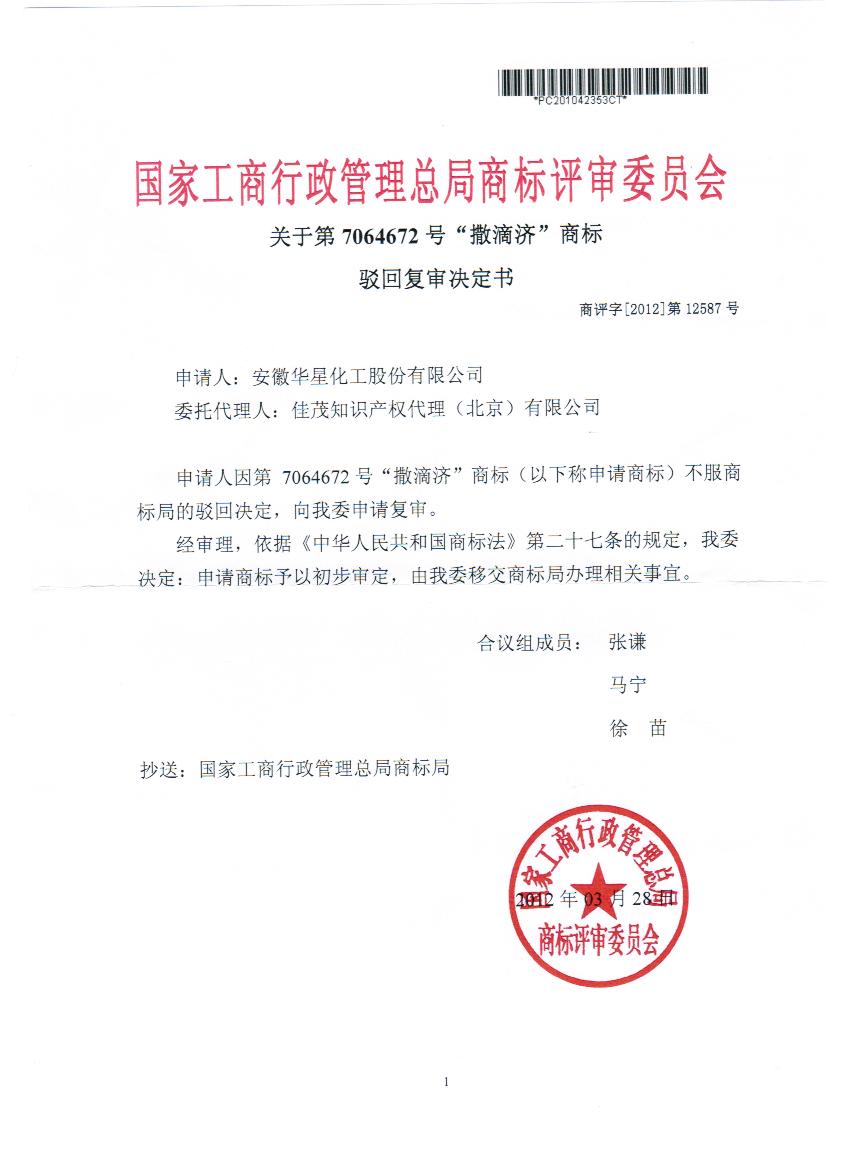 在此,对华星化工股份有限公司取得“撒滴济”商标专用权,表示祝贺。