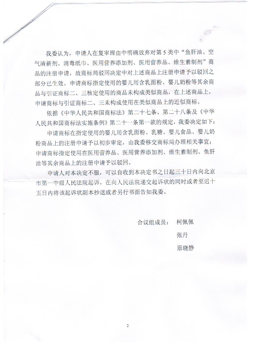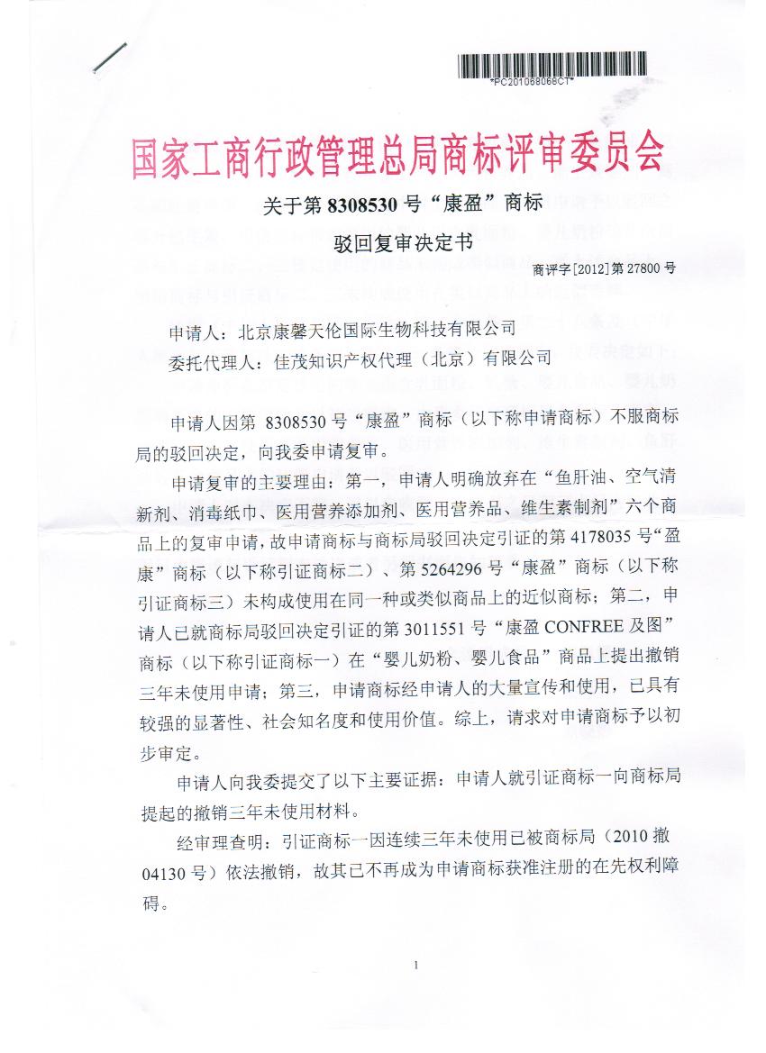 北京康馨天伦国际生物科技有限公司多次在第5类"婴儿用含乳面粉,乳糖,婴儿食品,医用营养品,医用营养添加剂,婴儿奶粉,维生素制剂,鱼肝油,空气清新剂,消毒纸巾"申请注册"康盈"商标,都被商标局驳回其申请. 北京康馨天伦国际生物科技有限公司与我司进行接洽,委托我司全权策划"康盈"商标在"婴儿食品与婴儿奶粉上注册,经过我司专业分析,北京康馨天伦国际生物科技有限公司也接受我司的建议,重新提出申请,且在申请的同时,对其阻碍商标进行清除,见另则公司新闻 经过商标评审委的评审,2012年6月27日决定"康盈"商标在"婴儿用含乳面粉,婴儿奶粉,乳糖,婴儿食品"上予以通过审查,由商标局安排公告。