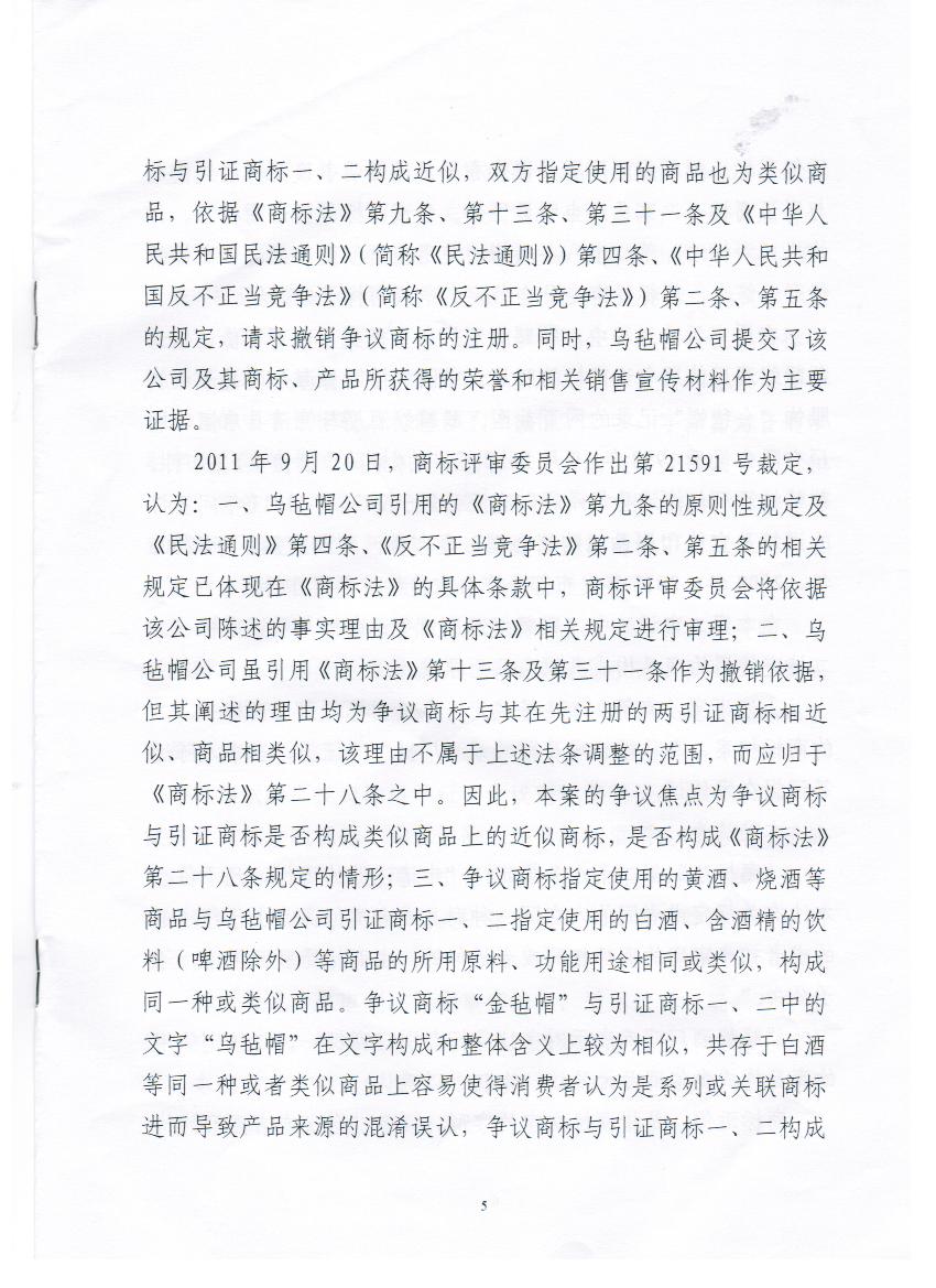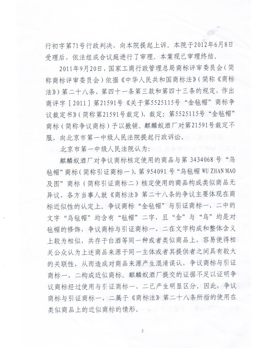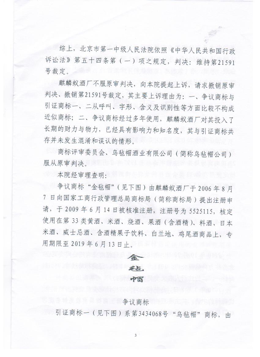 德清县浙北麒麟蚁酒厂不服北京市第一中级人民法院的判决,向北京市高级人民法院提起上诉,佳茂公司作为第三人的代理人参考诉讼,在法院上,佳茂公司充分维护了第三人的利益,阐述了“金毡帽”与“乌毡帽”是近似商标。 北京市高级人民法院2012年7月30日判决如下:原审判决认定事定清楚,适用法律正确,程序合同,应予以维持,德清县浙北麒麟蚁酒厂上诉理由均不能成立,对其上诉请求,本院不予支持。