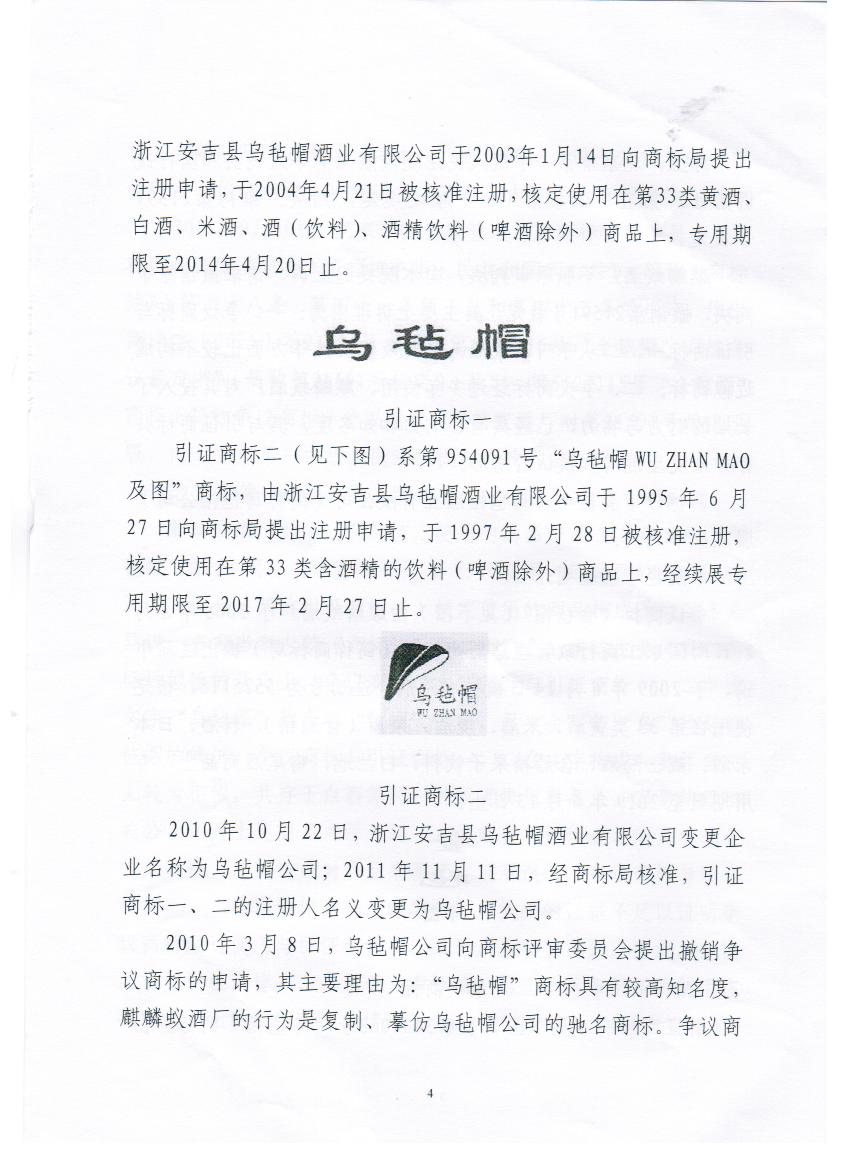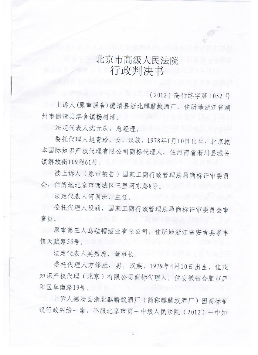 案件回顾: 佳茂公司成功代理乌毡帽酒业有限公司对德清县浙北麒麟蚁酒厂商标争议案件 佳茂公司成功代理乌毡帽酒业有限公司作为第三人参加北京一中院诉讼代理