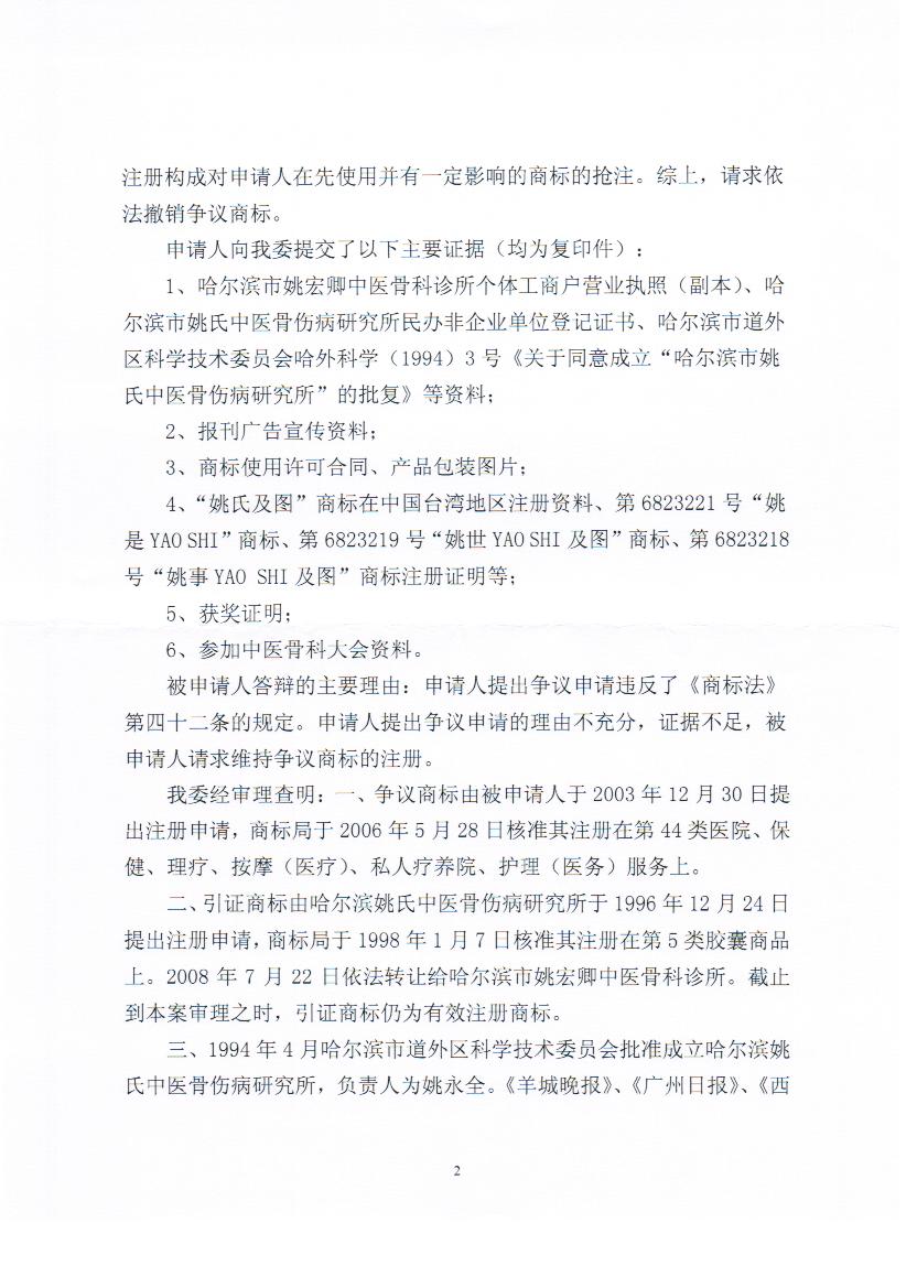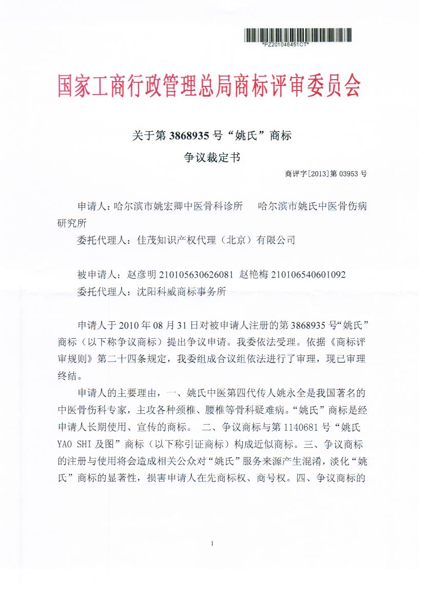 佳茂公司成功为哈尔滨姚宏卿中医骨科诊所抢回“姚氏”商标2013-4-21 10:14:45 |
