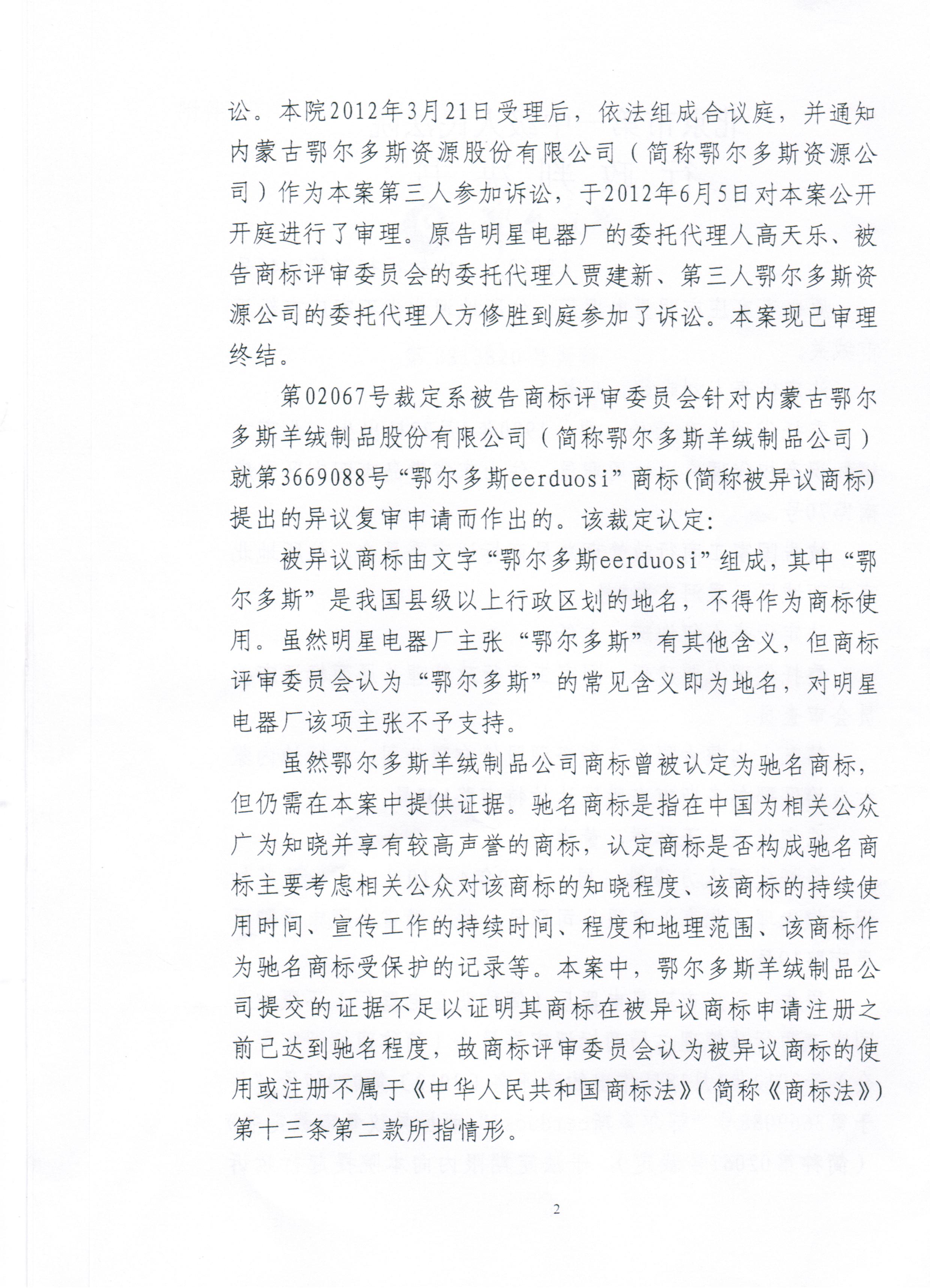 2003年08月12日,石家庄市明星电器厂向商标局申请注册"鄂尔多斯EERDUOSI"商标,初审公告号为3669088,内蒙古鄂尔多斯资源股份有限公司(原内蒙古鄂尔多斯羊绒集团有限责任公司)对商标局提出异议,经过商标局审查,该商标予以撤销,但是石家庄市明星电器厂不服商标局的异议裁定,向商标评审委员会申请复审,该案件引起商标评审委员会的重视,在常委会议论,还是认同,"鄂尔多斯"县级以上的地名,决定商标局异议决定认定事实清楚,适用法律正确,该商标予以驳回. 石家庄市明星电器厂不服商标评审委员的决定,予法定期限内向北京市第一中级人民法院起诉,佳茂公司作为内蒙古鄂尔多斯资源股份有限公司代理人,参加庭审,全面阐述了事实理由,北京市第一中级人民法院予2012年6月19日正式判决,3669088号"鄂尔多斯EERDUOSI"予以撤销。 对此,对内蒙古鄂尔多斯资源股份有限公司维护品牌的决心表示支持。